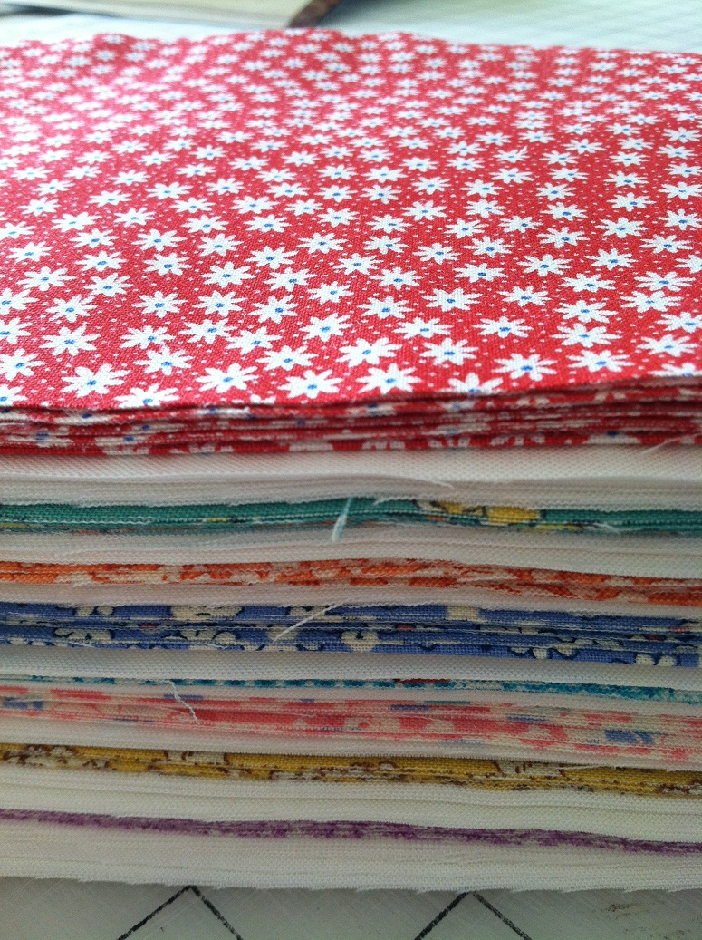 I have cut all of my white fabric into the 6 1/2" squares that I need and also cut the reproduction fabric for the first eight of the months. I am going to decide what colors I want to do for the other two months later on. I stacked them all and put them back into the cabinet-ready to come out and be sewn at a moment's notice.